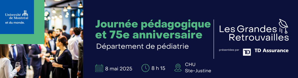 Pour souligner son 75e anniversaire, le Département de pédiatrie est fier d’organiser une journée pédagogique pour tous ses gradué.e.s qui travaillent au quotidien avec des externes et des résidents. Notre but est de stimuler la réflexion et l’échange sur des idées pédagogiques innovantes appliquées à la pratique clinique qui contribueront à l’enseignement de demain.
